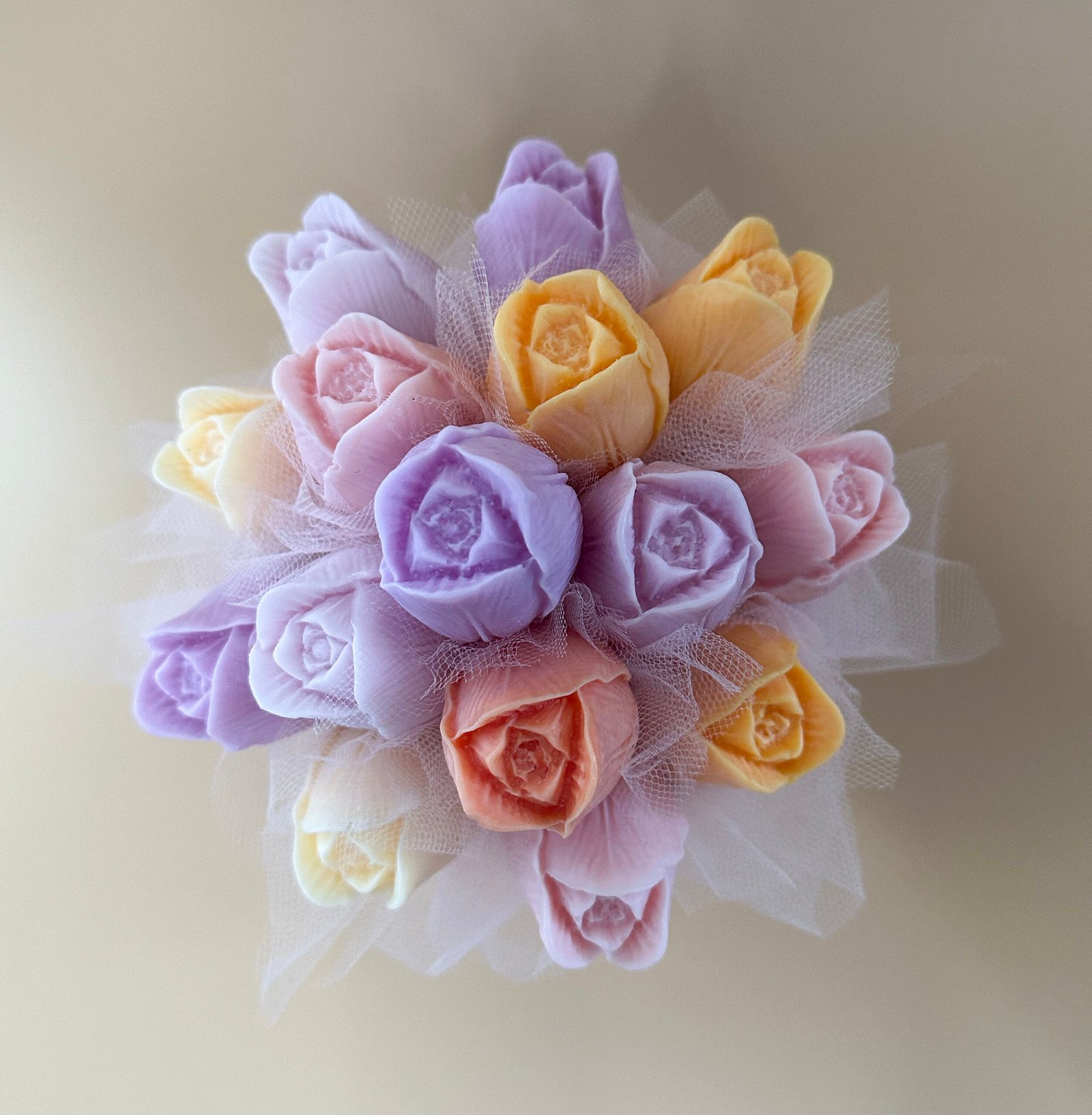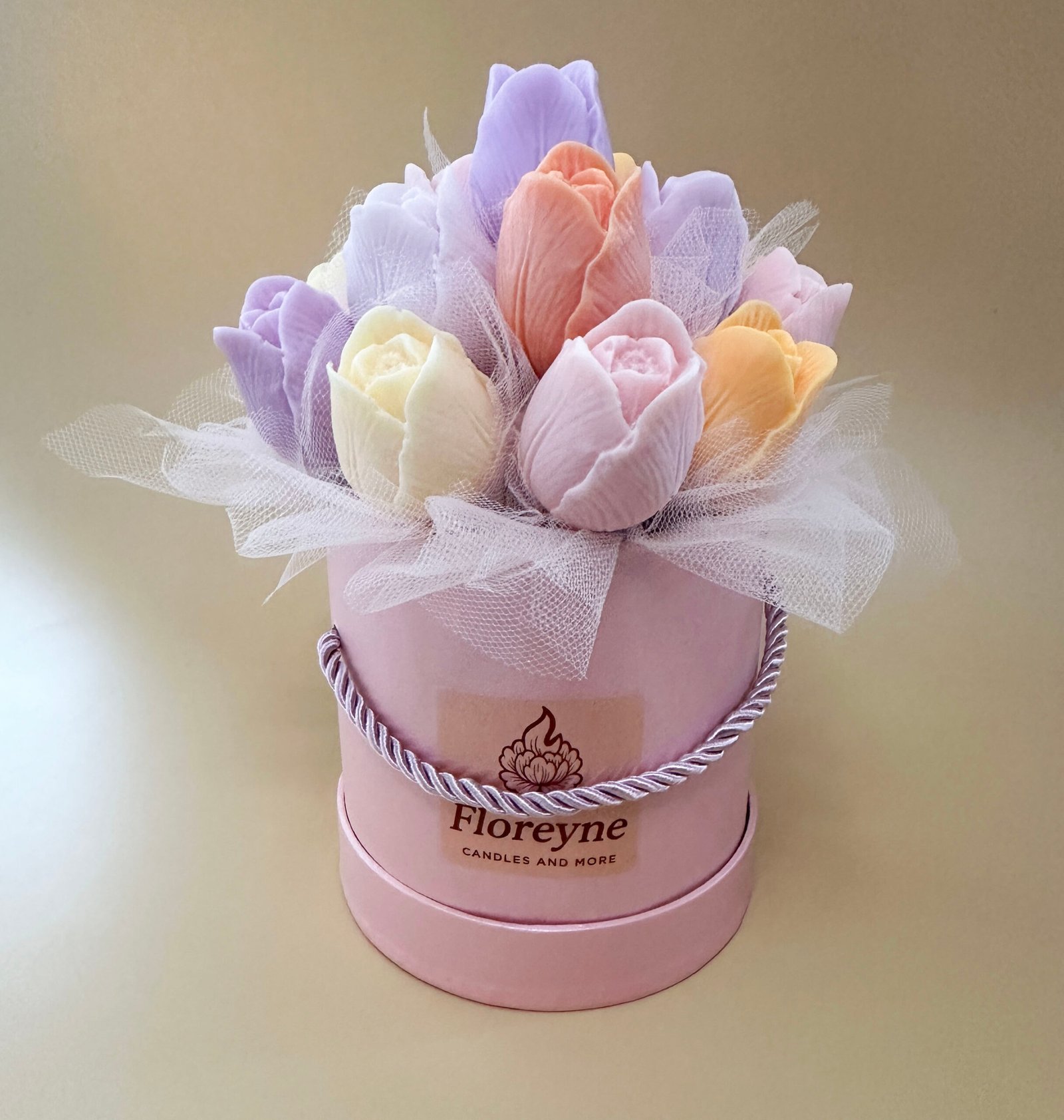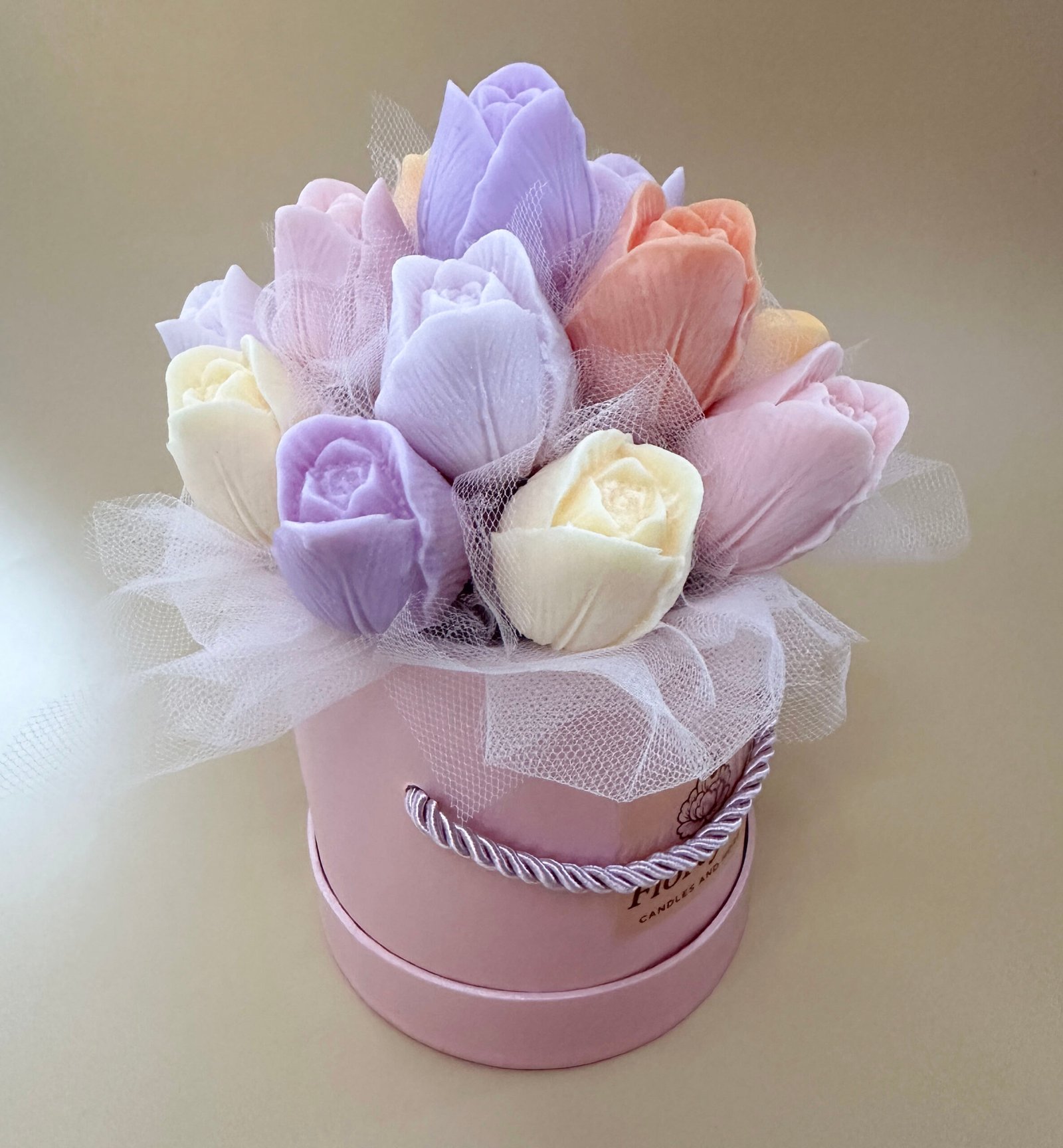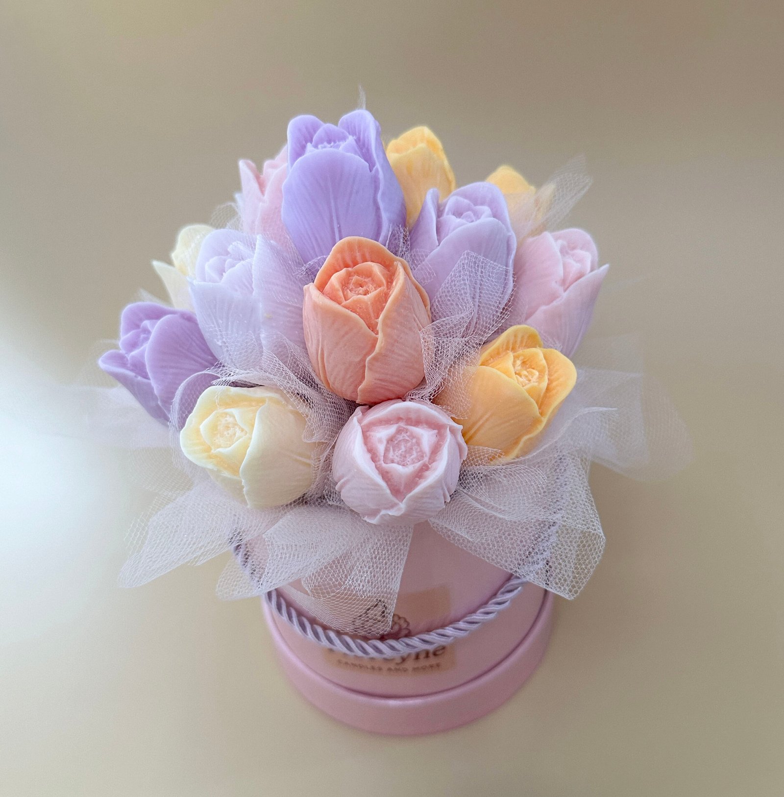 Elegancki Candle Flower Box wykonany z tulipanów z wosku sojowego w różnych, wiosennych kolorach.