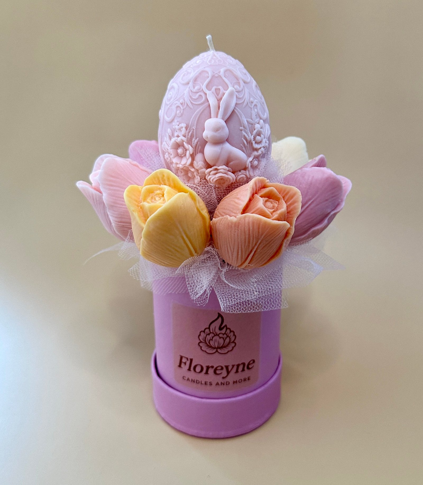 Elegancki Candle Flower Box wykonany z tulipanów z wosku sojowego w różnych, wiosennych kolorach. W samym centrum boxu znajduje się kolorowe jajko–świeczka. Po wyjęciu z kompozycji można umieścić je na podstawce i zapalić jak klasyczną świecę. To wyjątkowe połączenie dekoracji i funkcjonalności, idealne na wiosnę i Wielkanoc. 🌸🥚